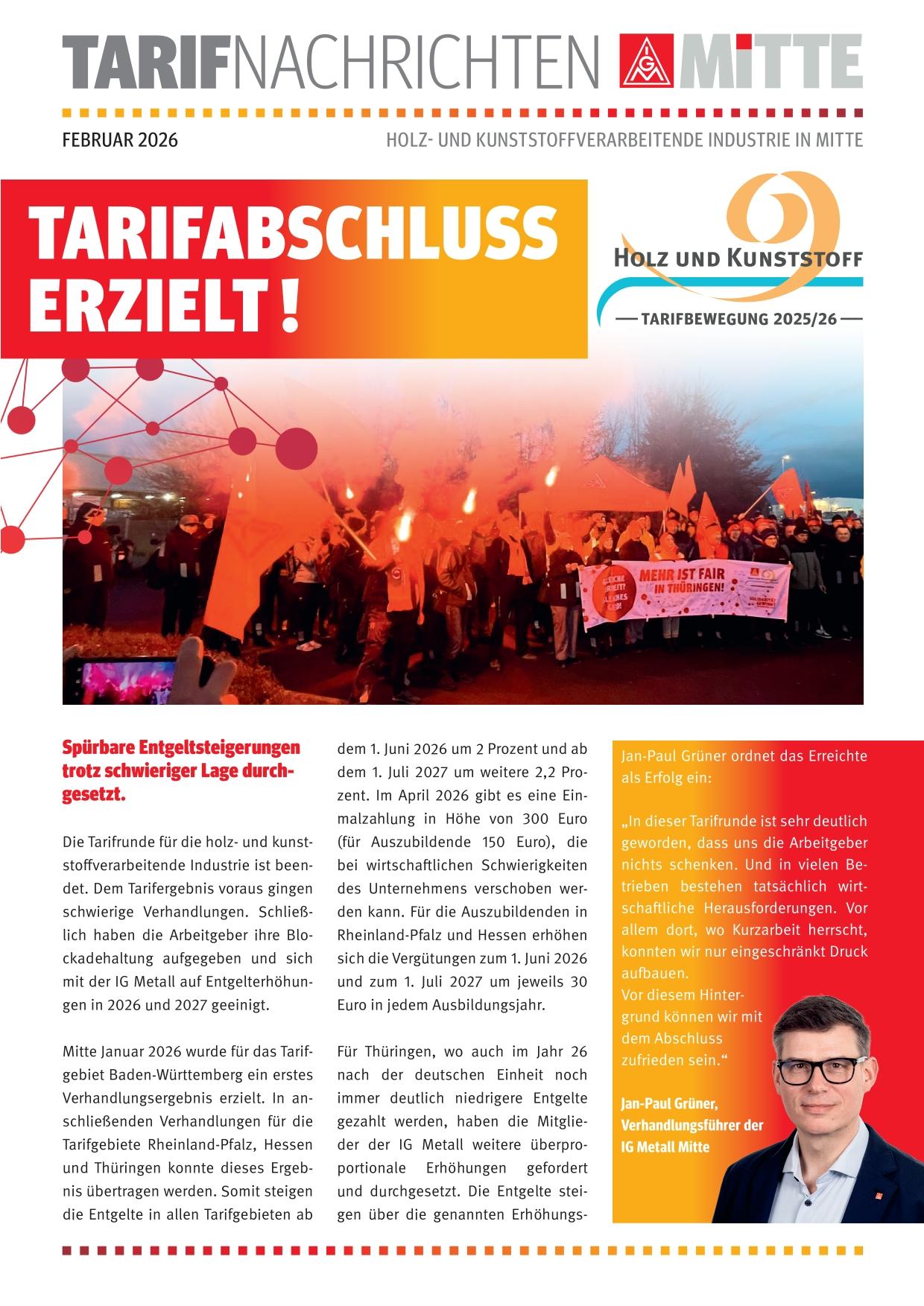 Die Entgelte der rund 24.800 Beschäftigten der holz- und kunststoffverarbeitenden Industrie in Hessen steigen in zwei Schritten: Ab 1. Juni 2026 werden die Entgelte um 2 Prozent und ab 1. Juli 2027 um weitere 2,2 Prozent angehoben.